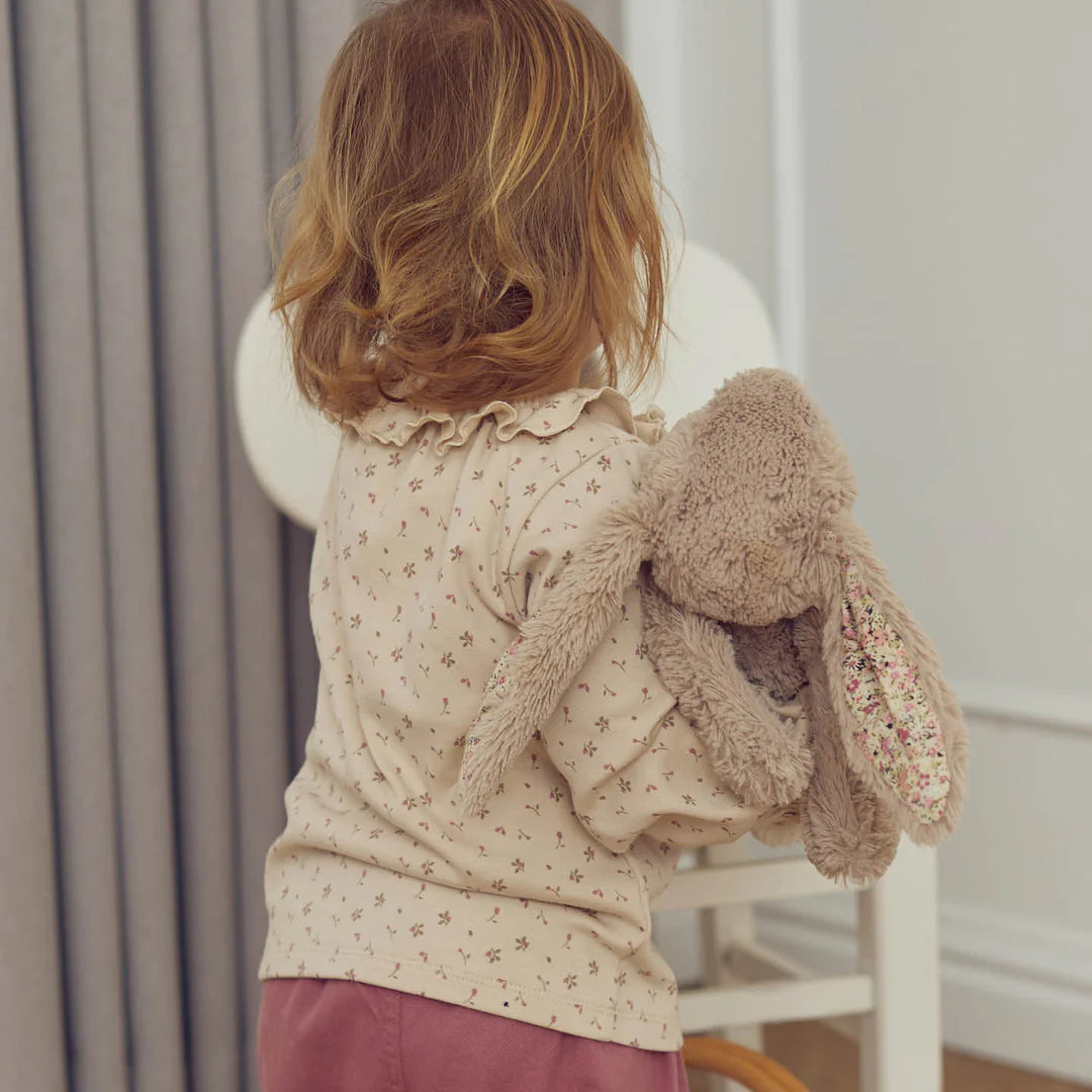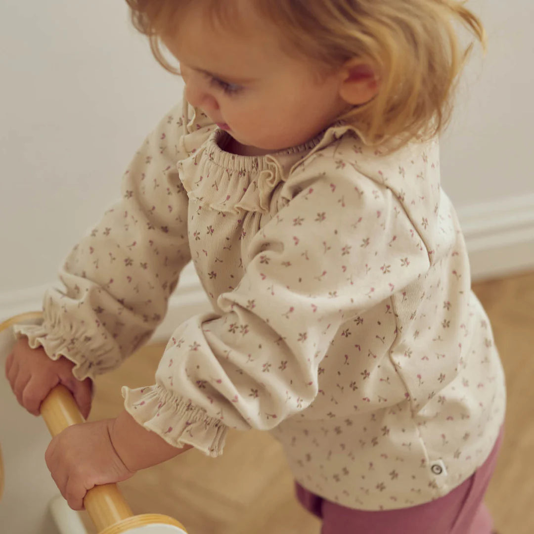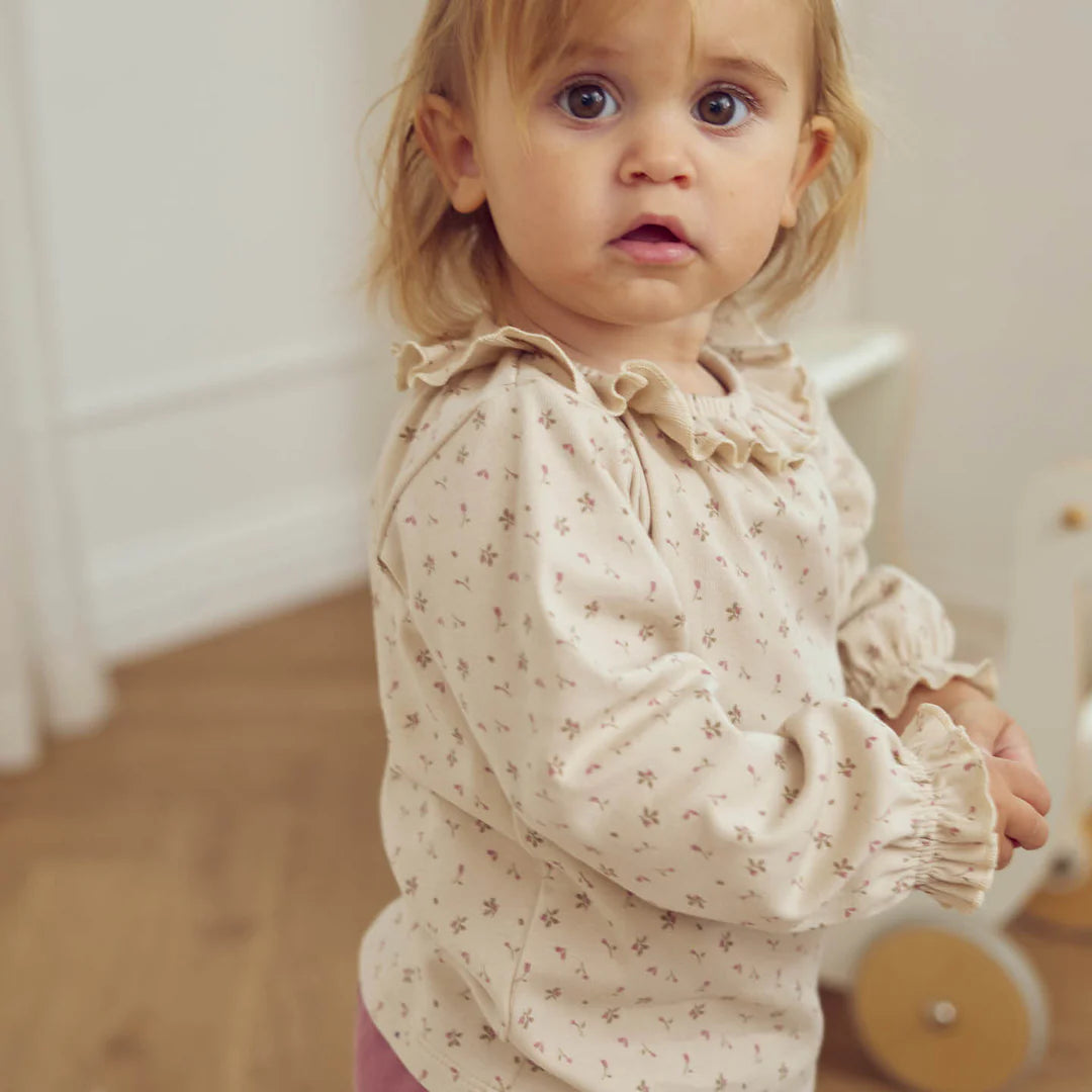 Ontdek deze prachtige top met lange mouwen die zowel stijlvol als comfortabel is. De top is versierd met een inspirerende all over print van lieve kleine bloemetjes , perfect voor een vrolijke en zachte uitstraling. Een mooie decoratieve volantkraag verwijdert een charmant detail teen aan de halslijn.