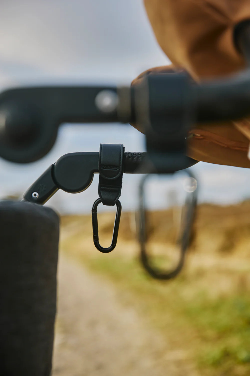 De haken worden met een klem aan de duwstang bevestigd en hebben een sterke klittenbandsluiting. Met de twee karabijnhaken hangt u zware tassen, handtassen en andere benodigdheden moeiteloos op. De set bestaat uit twee haken, gemaakt van 100% leer.