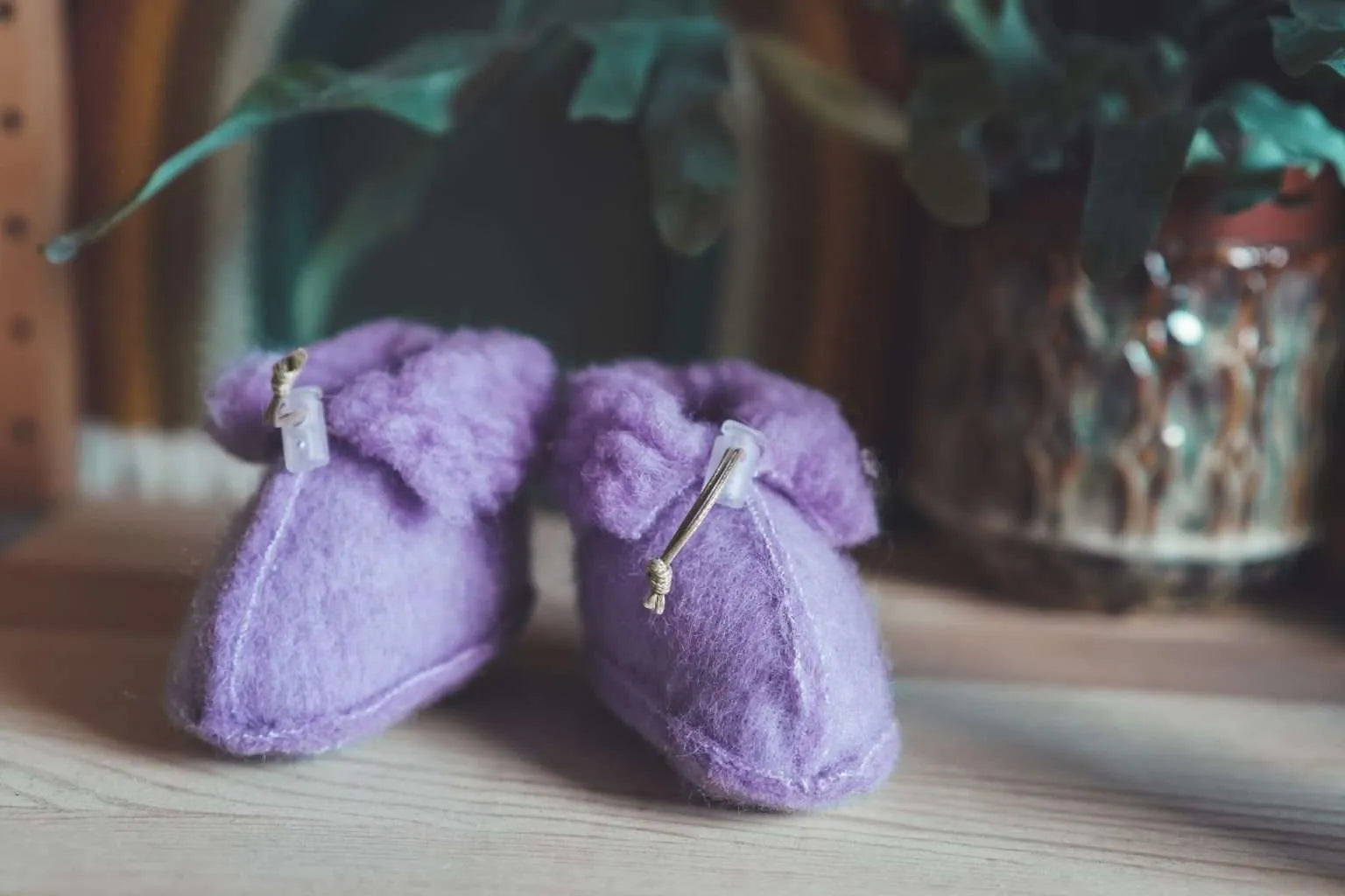 Onze wollen slofjes in lila zijn warm, comfortabel en stijlvol. De zachte lila kleur combineert prachtig met zowel neutrale als vrolijke outfits en geeft elke look een frisse, zachte touch.