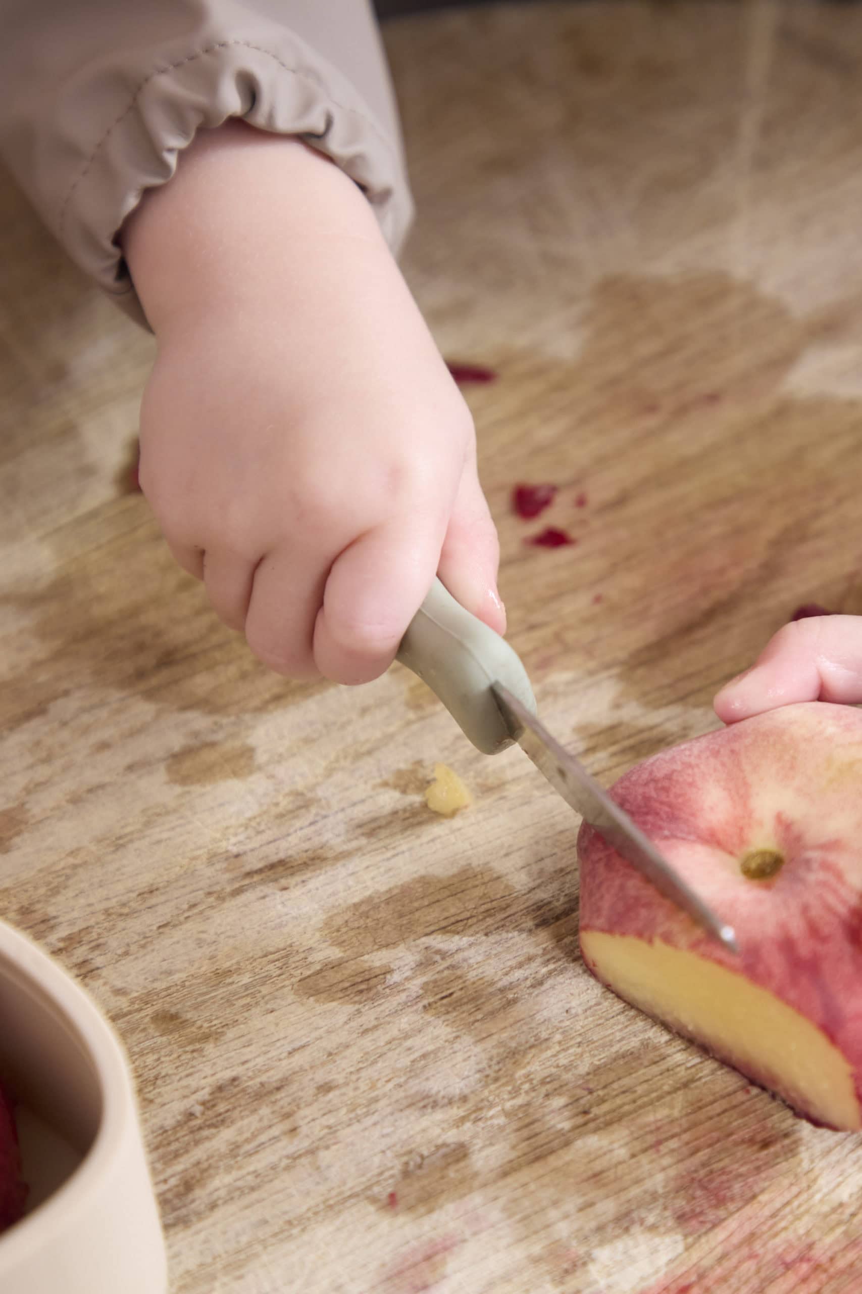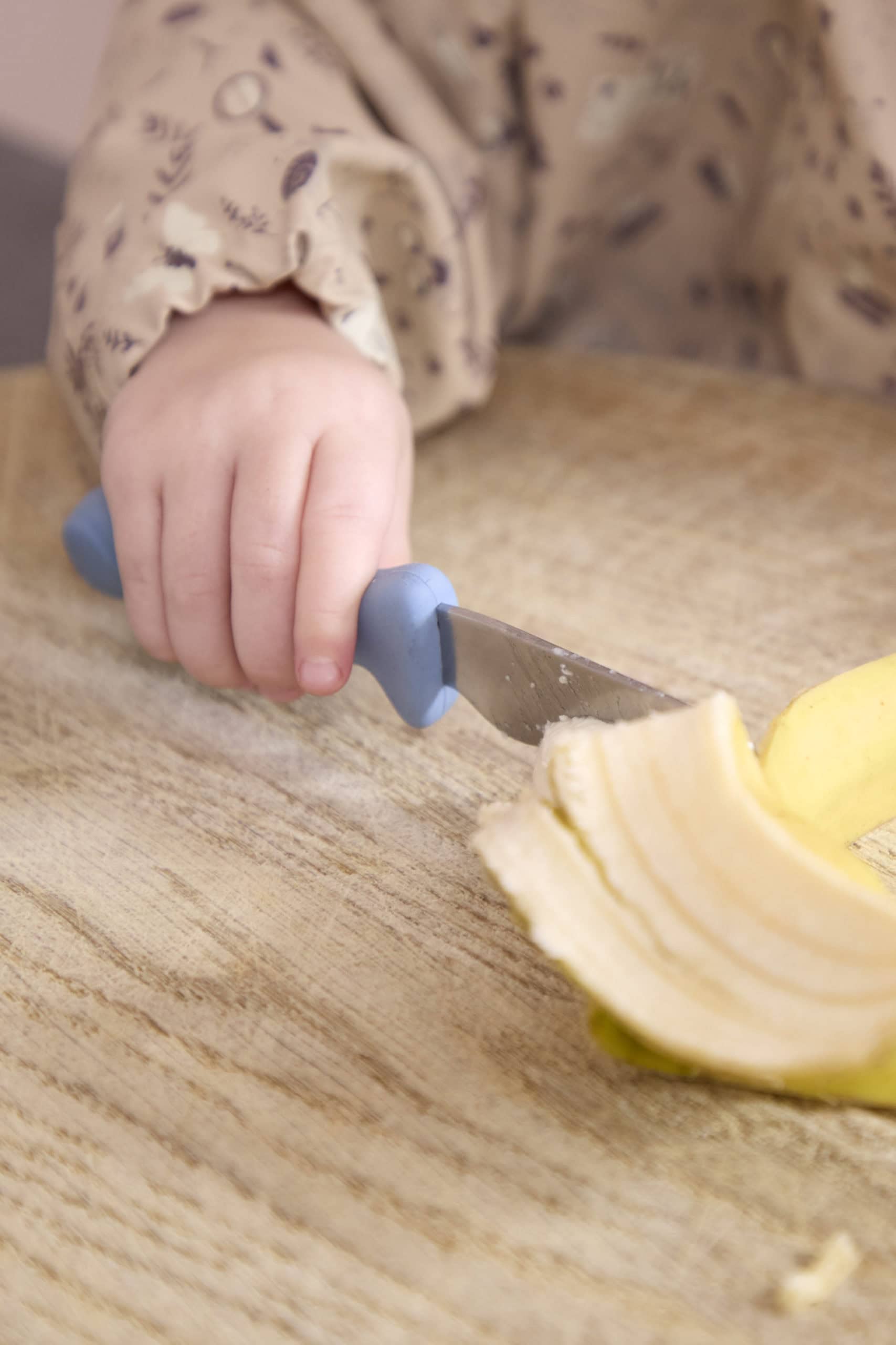 Deze set beginnersmessen bevat een gekarteld mes en een mes met een "normaal" roestvrijstalen blad, waarmee je fruit en groenten kunt snijden. De zachte siliconen handgrepen met een veiligheidsbarrière tussen het blad en de vingers zijn gemakkelijk vast te houden voor kleine handjes.