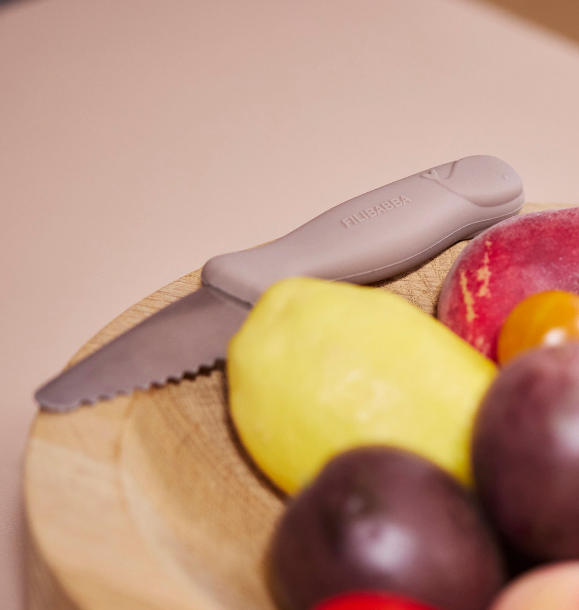 Deze set beginnersmessen bevat een gekarteld mes en een mes met een "normaal" roestvrijstalen blad, waarmee je fruit en groenten kunt snijden. De zachte siliconen handgrepen met een veiligheidsbarrière tussen het blad en de vingers zijn gemakkelijk vast te houden voor kleine handjes.