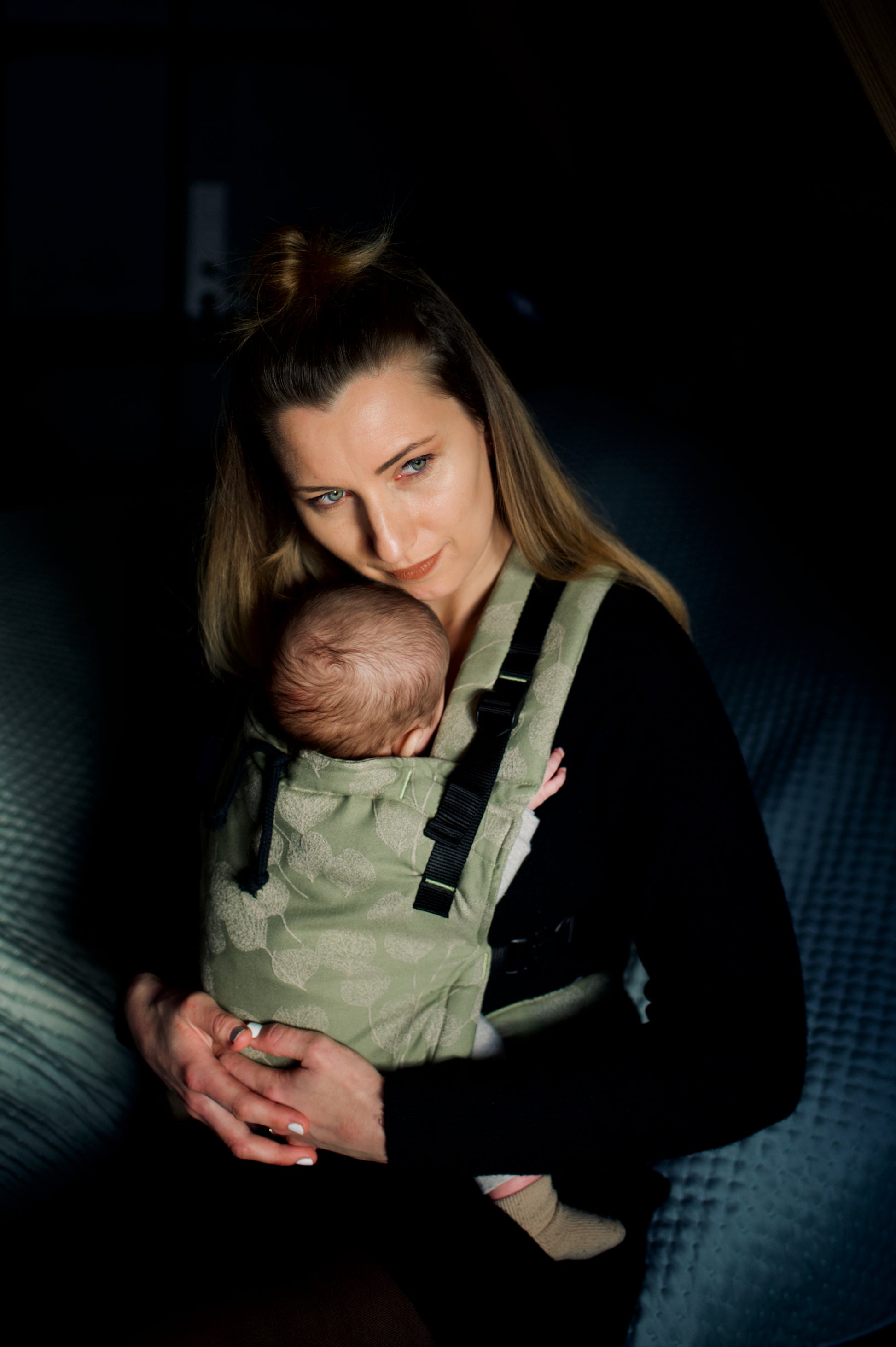 - De schouderbanden worden recht gedragen en lopen naar het rugpand van de draagzak.