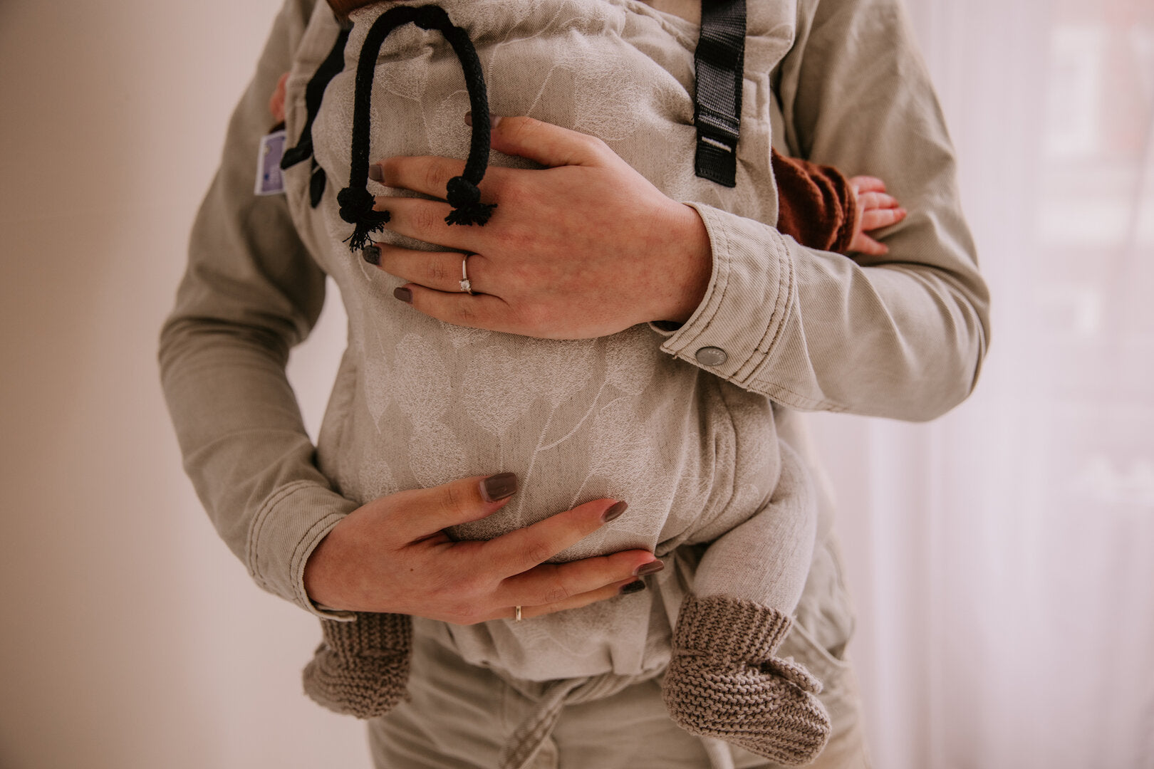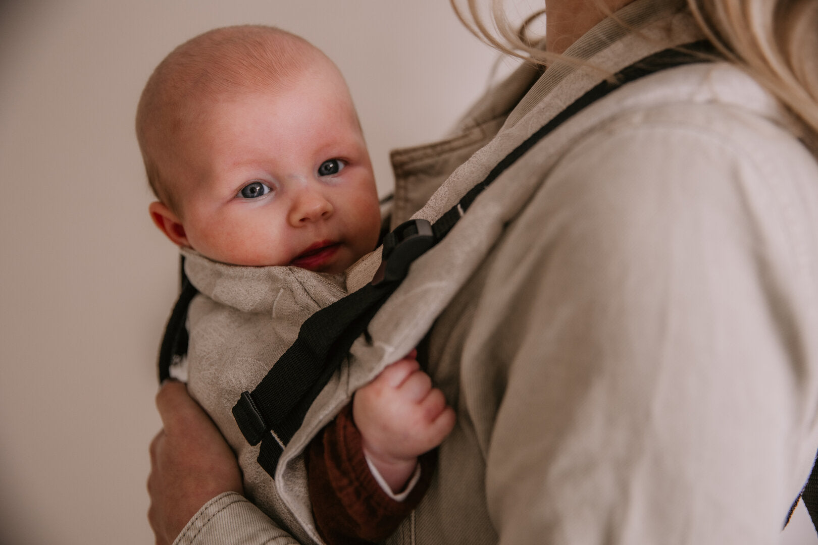 De draagzak is gemaakt van een mix van linnen en katoen.