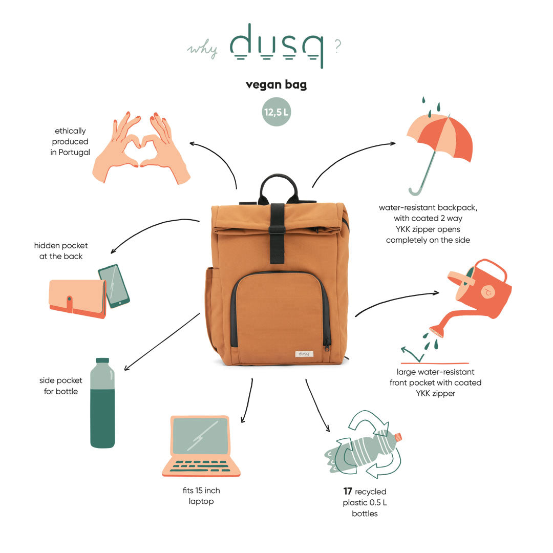 De Dusq Canvas Vegan Bag is een handige rugtas waarmee je van alle gemakken bent voorzien. De tas biedt voldoende opbergruimte aan de binnenkant met 1 groot hoofdvak die ook beschikt over een gevoerde laptop-vak. Hierdoor kan je zelfs je 15inch laptop mee op reis nemen. In het voorvak neem je veilig natte of vochtige kleertjes in mee. Doordat het vak waterdicht is lekt dit niet door naar andere vakken. Aan de zijkant kan je een drinkfles insteken en in het andere zijvak kan je kleine en waardevolle spulletjes kwijt. Al met al is het een super handige tas, want er moet natuurlijk heel wat spulletjes mee als je er met je kindje op uit gaat. Verder is de tas gemaakt van hoogwaardig materiaal en sluit aan de bovenkant met een magnetische drukknoop.