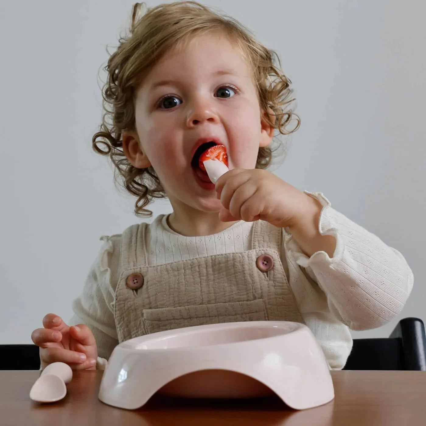 Is je kind rechtshandig, zet de hoge kant dan aan de linkerkant voor je peuter neer. Zo kan je kind het eten makkelijk met de rechterhand scheppen. Is je kind linkshandig, dan geldt het omgekeerde. Door de robuuste vorm staat de peuterkom stabiel op tafel. Hierdoor kan de kom niet omkiepen en voorkom je geknoei.