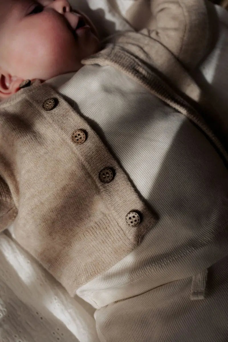 Dit merinowollen baby vestje in beige is een onmisbare toevoeging aan de garderobe van je kleintje. Gemaakt van 100% fijne en hoogwaardige merinowol, biedt dit vestje de perfecte combinatie van natuurlijke warmte en ultiem ademend comfort, ideaal voor alle seizoenen.