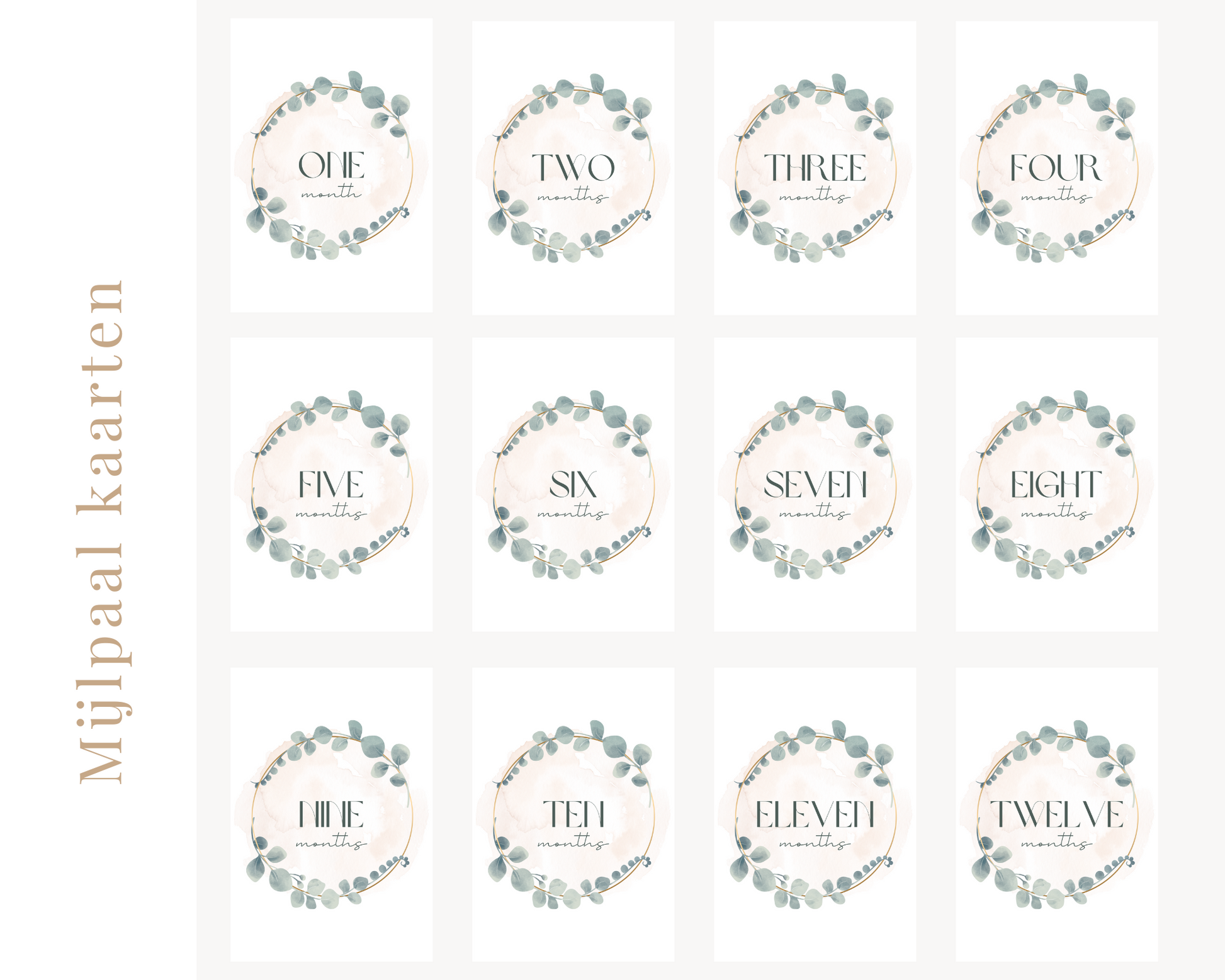Welkom bij onze botanische mijlpaal kaarten voor baby's! Onze downloadbare set bevat 12 prachtig ontworpen mijlpaal kaarten in een botanische stijl, perfect voor het vastleggen van de bijzondere momenten en mijlpalen van uw kleintje.