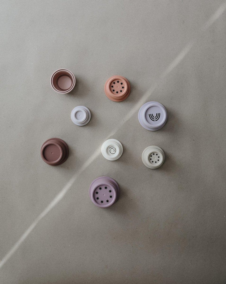 De Mushie Stacking Cups zijn een uitstekende stimulans voor de ontwikkeling van fijne motoriek en hand-oog coördinatie. De grootste beker meet 8.5 x 5 cm, terwijl de kleinste 5.5 x 3.5 cm is. De totale hoogte van de toren is 30 cm.