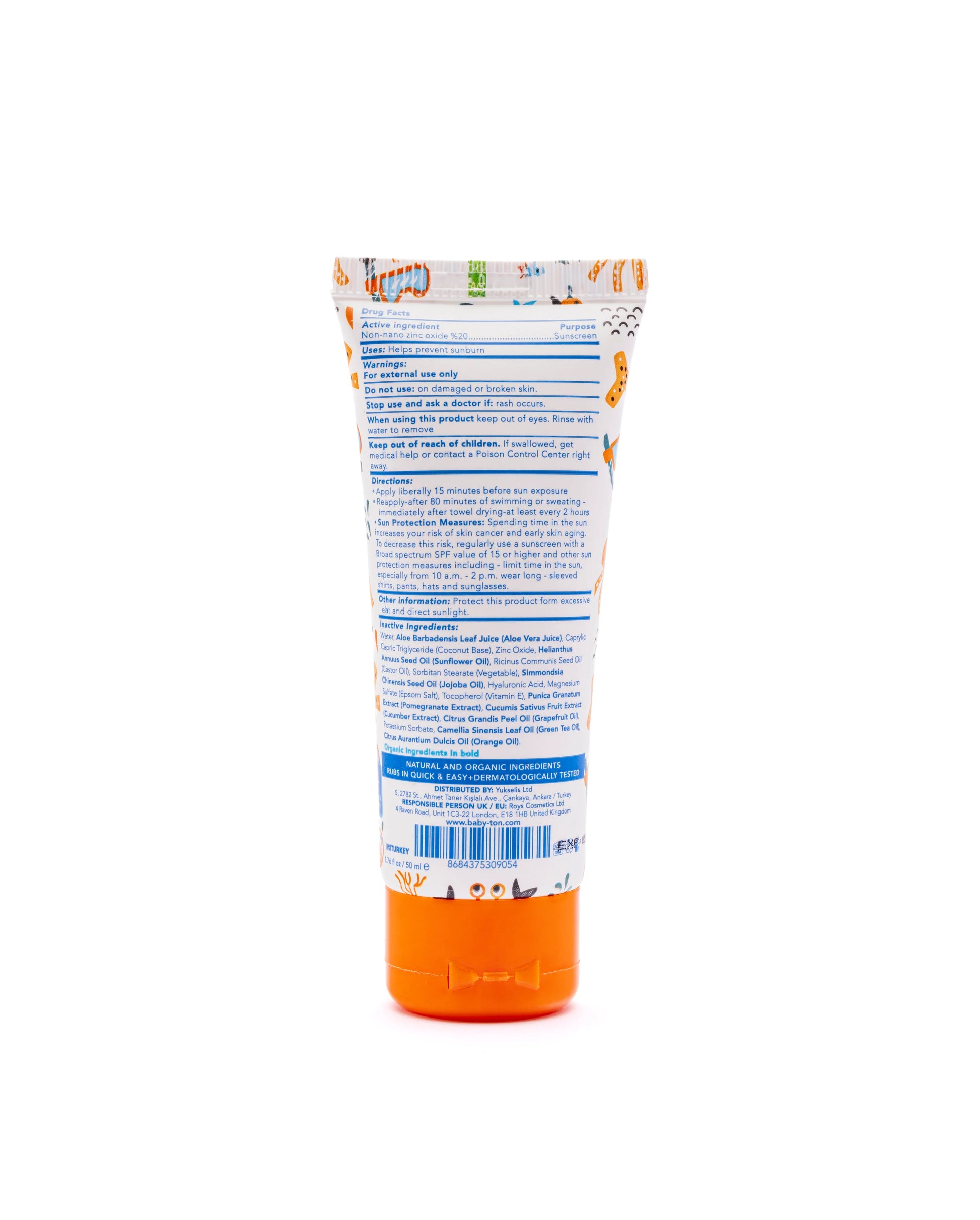 Ingrediënten: Non-Nano Zinc Oxide, Water, Aloe Barbadensis Leaf Juice, Caprylic/Capric Triglyceride (Coconut Base), Helianthus Annuus Seed Oil, Ricinus Communis Seed Oil, Sorbitan Stearate (Vegetable), Simmondsia Chinensis Seed Oil, Hyaluronic Acid, Magnesium Sulfate (Epsom Salt), Tocopherol (Vitamin E), Punica Granatum Extract, Cucumis Sativus Fruit Extract, Citrus Grandis Peel Oil, Potassium Sorbate, Camellia Sinensis Leaf Oil, Citrus Aurantium Oil.