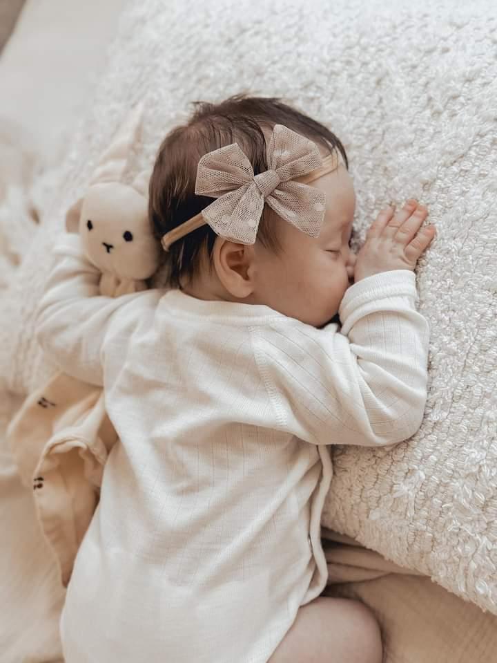 Verwen je kleine meid met de Valerie Thule haardbandjes van By Mev Bouwtique - de perfecte accessoire voor ultiem comfort en stijl! Gemaakt van zacht, rekbaar nylon met een prachtige fluwelen strik van 7 cm, zijn deze haarbandjes perfect voor pasgeborenen en blijven ze comfortabel tot 18 maanden oud.