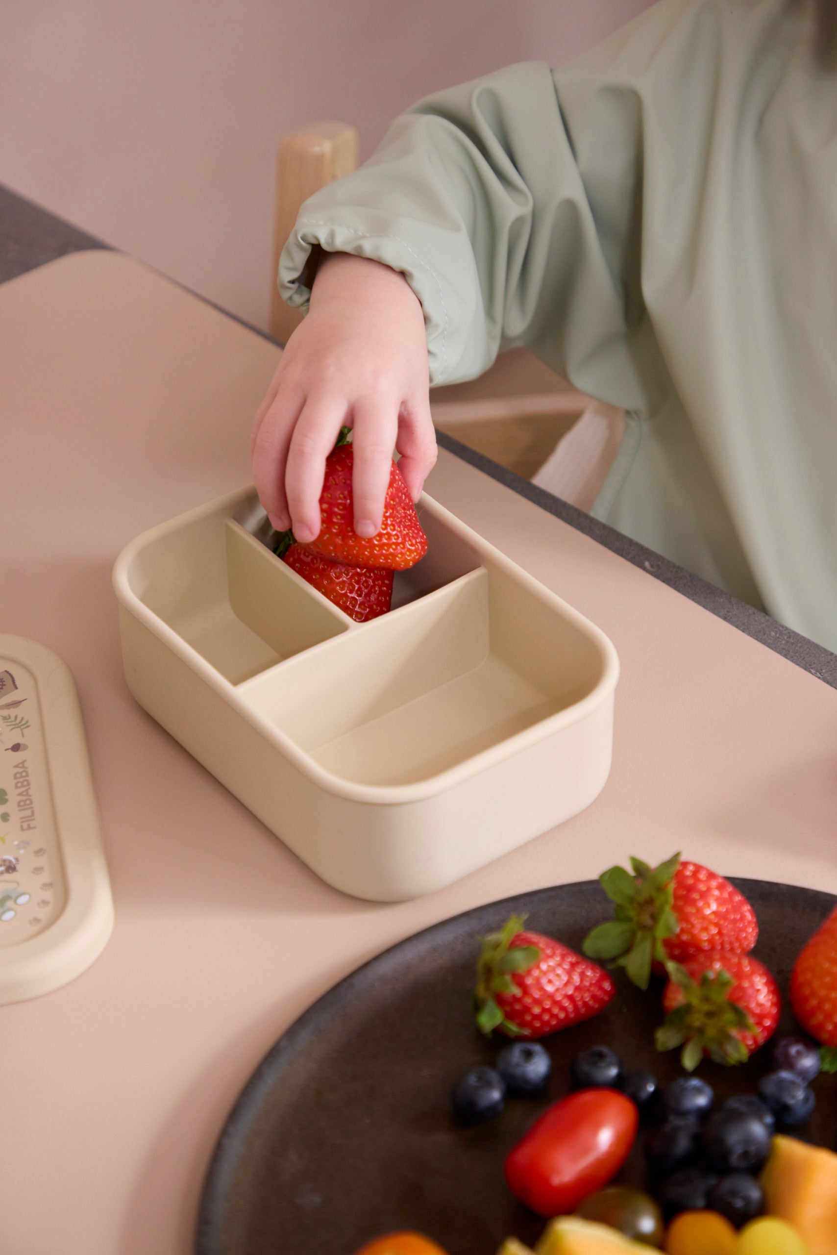 Schattige en praktische lunchbox van 100% zacht, voedselveilig siliconen. Met zijn inhoud van 700 ml is er genoeg ruimte voor snacks. De lunchbox is verdeeld in 3 kleinere compartimenten, zodat het eten gescheiden kan blijven, zoals veel kinderen dat prefereren. Het flexibele deksel sluit goed af, zodat alles op zijn plaats blijft.