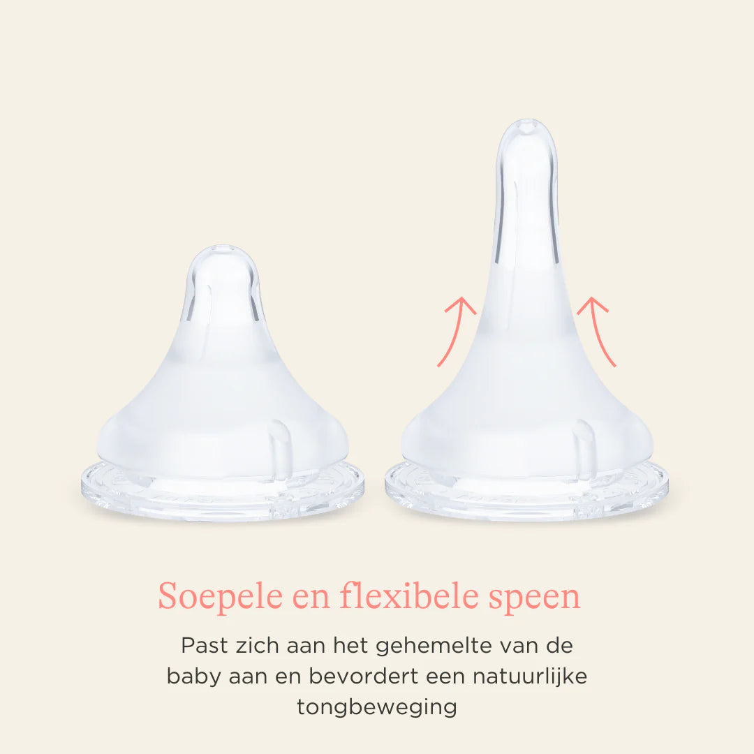 • Natuurlijk drinkgedrag: De speen is ontworpen om het natuurlijke zuigpatroon van je baby te stimuleren, net zoals bij borstvoeding.