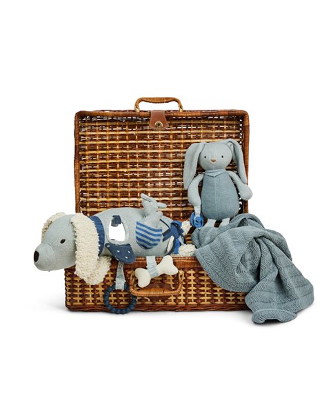 Het dekentje heeft een stijlvol visgraatmotief in een rustgevende lichtblauwe kleur, wat het een tijdloze en elegante uitstraling geeft. Met een royale afmeting van 80x100 cm is het ideaal voor in de wieg, de kinderwagen of als zacht speelkleed.