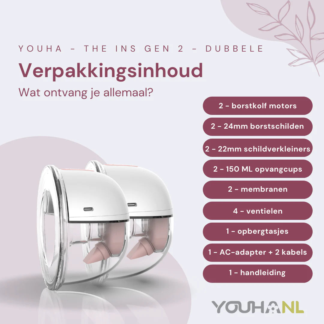 De Youha dubbele Gen 2 borstkolven zijn zeer handige, draadloze en draagbare borstkolven. Deze borstkolven bieden een mobiele kolfmethode die de kwaliteit en effectiviteit van een niet-mobiele kolf behoudt, zodat je snel en efficiënt kunt kolven naar jouw wens. De gebruiker kan de borstkolven gebruiken met de My Youha app, maar ook handmatig. Het aanleggen van de borstkolven gaat zeer snel, daarna doen de borstkolven haar werk. De melk wordt opgevangen in de cups en is makkelijk over te schenken in flesjes of zakjes.