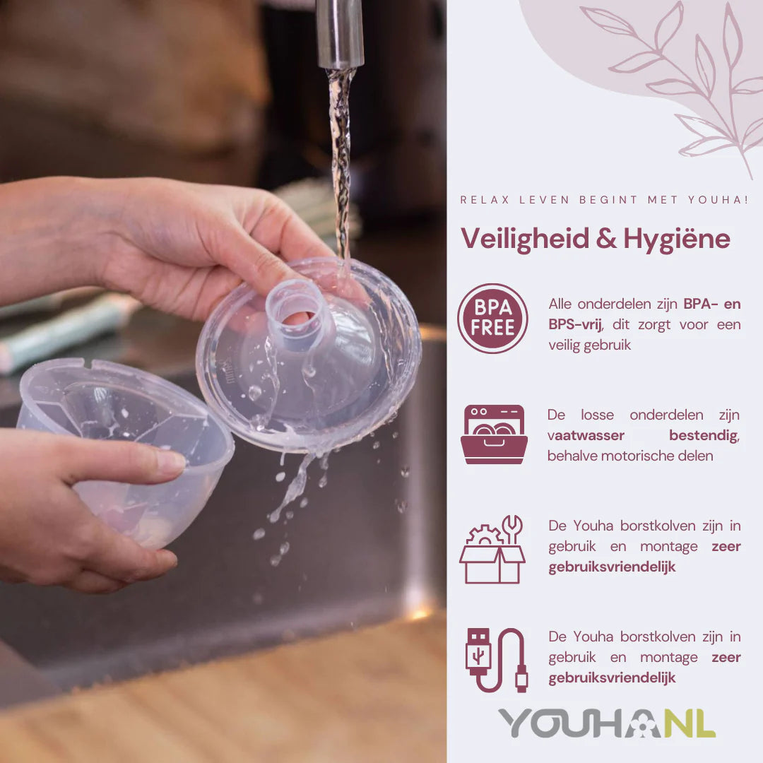 Dit product betreft een dubbele Youha borstkolf set. Dit maakt het direct mogelijk om draadloos dubbelzijdig te kolven, zelfs in het bijzijn van anderen. Tijdens het kolven kun je makkelijk je trui, vest of shirt over de kolven heen doen zodat je niet apart hoeft te zitten.