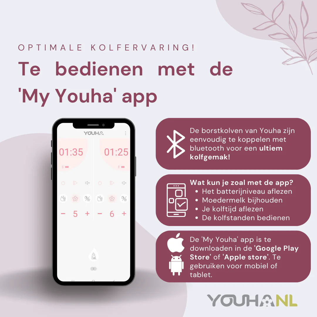 Deze draagbare en draadloze borstkolven zijn te bedienen met een app, de 'My Youha' app. De My Youha app is beschikbaar in het Nederlands voor iOS en Android. Op de verpakking is een QR-code vermeld die je rechtstreeks de mogelijkheid geeft om de app te downloaden. Er zijn diverse mogelijkheden, zoals het bedienen van de motoren, maar ook het bijhouden van kolftijd en hoeveelheid gekolfde moedermelk.