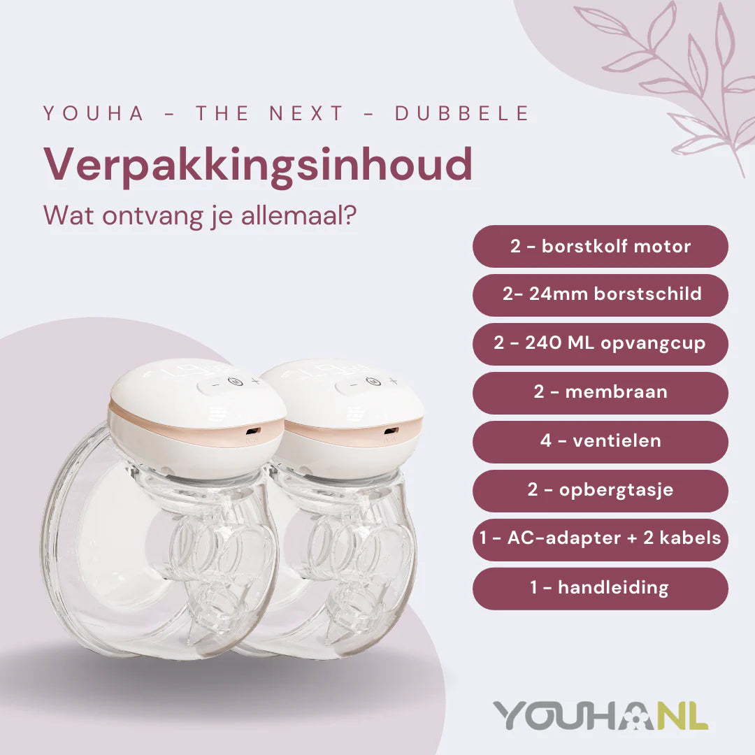 De Youha The INs Next heeft geen slangen, draden of bengelende flessen, wat het mogelijk maakt om kwalitatief mobiel te kolven. Het betreft een alles-in-één kolf, montage is zeer eenvoudig en alle onderdelen (behalve de motor) kunnen gesteriliseerd worden d.m.v stoomsterilsatie of kokend water.